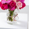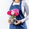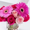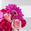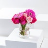 ترتيب زهور جميل في فازة بدرجات مختلفة من اللون الوردي، مبرزًا جربيرا وورود الجوري الفوشيا الحيوية، مع لمسة خفيفة من الورود الفاتحة. مثالي لجميع الهدايا.