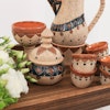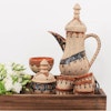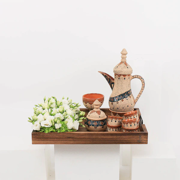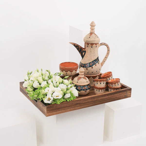 ر.س1645تنسيق يحتوي على زهور الايستوما البيضاء مع الهايدرنجا الخضراء وطقم القهوه السعوديه المصنوع من الفخار اليدوي