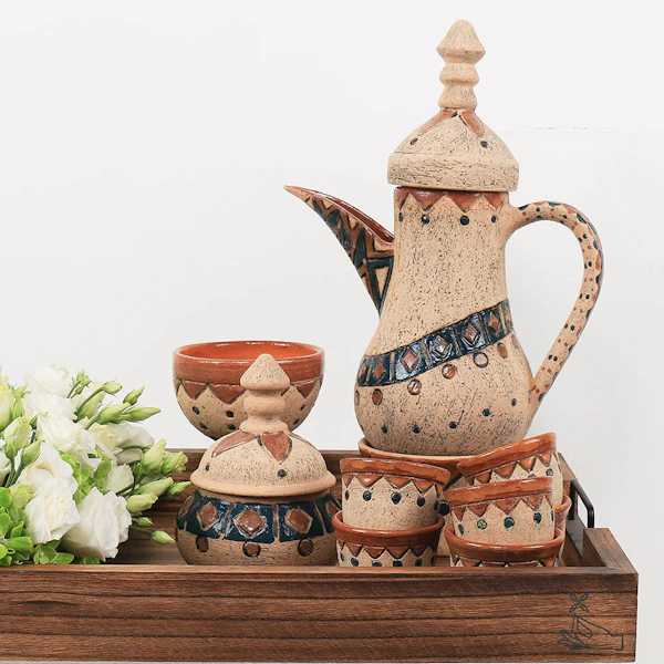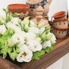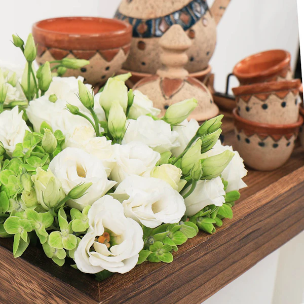 تنسيق يحتوي على زهور الايستوما البيضاء مع الهايدرنجا الخضراء وطقم القهوه السعوديه المصنوع من الفخار اليدوي