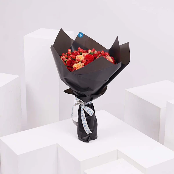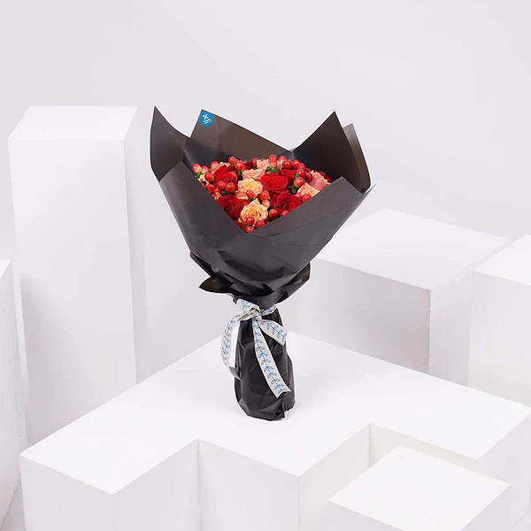 AED310Bouquet conatins the orange roses and the red roses with the red hypericum