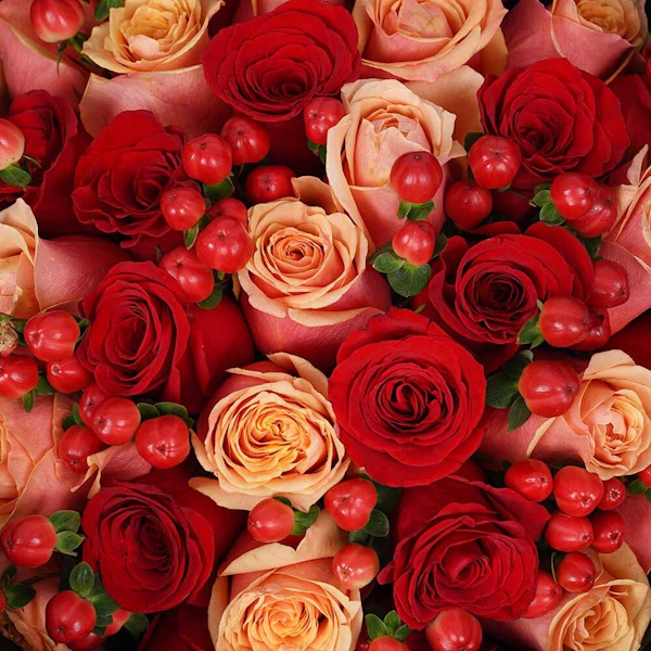 Bouquet conatins the orange roses and the red roses with the red hypericum