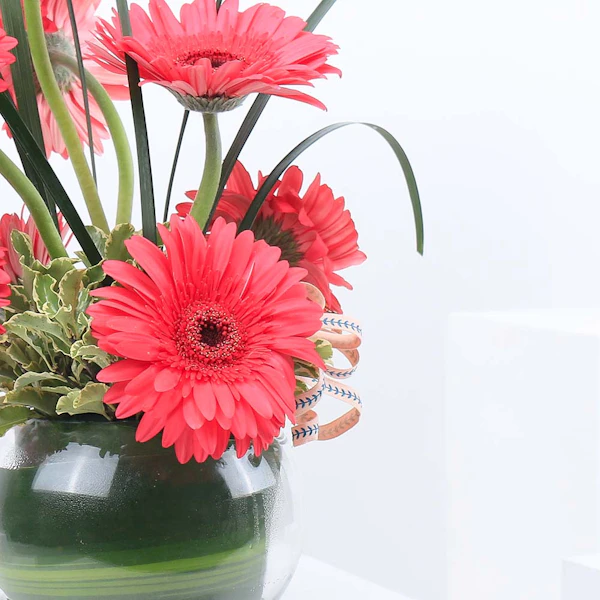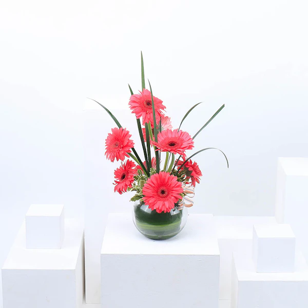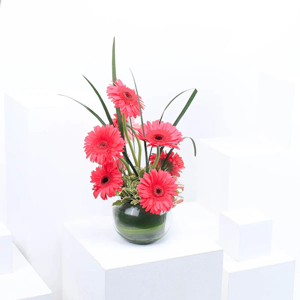 Adorn your space with the delicate charm of Pink Gerbera arranged in a Fishbowl Glass Vase, featuring eight vibrant flowers. This elegant gift combines the natural beauty of fresh Pink Gerbera with the modern simplicity of a clear glass vase, creating a graceful centerpiece or decorative accent. Perfect for brightening any room or conveying heartfelt sentiments, this arrangement exudes freshness and sophistication, making it an ideal choice for various occasions from birthdays to anniversaries or simply to uplift someone's day with its cheerful allure.