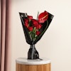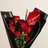 Celebrate with elegance and sophistication with this bouquet of red roses and a red anthurium flower decorated with green steel grass in black wrapping. This enchanting bouquet combines the beauty of red roses with the luxury of the anthurium flower to add a touch of magic and elegance to your special celebrations. Make this bouquet an expression of joy and love.