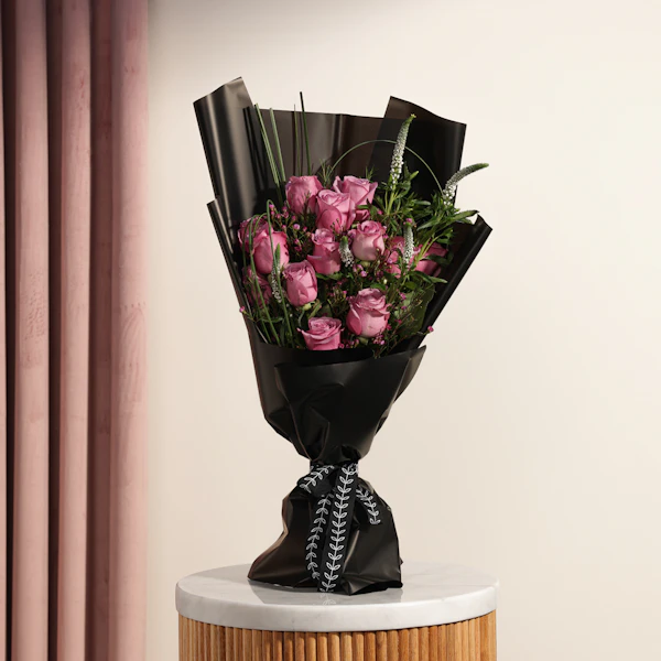 AED270Make your loved ones day special this year with the unique flower bouquet we offer. This bouquet consists of purple roses and white Veronica with a charming touch of purple wax flower, elegantly packaged in a luxurious black wrapper. Choose this bouquet to be your gift for your loved ones, as it is a unique expression of elegance and beauty that will bring them joy and happiness on this special occasion. Order now and make your loved people day unforgettable moments filled with the scent of joy and love.