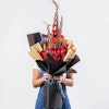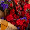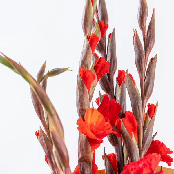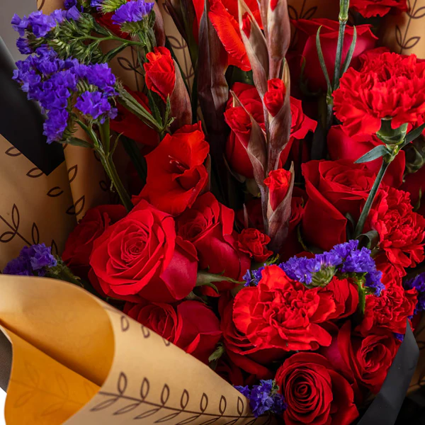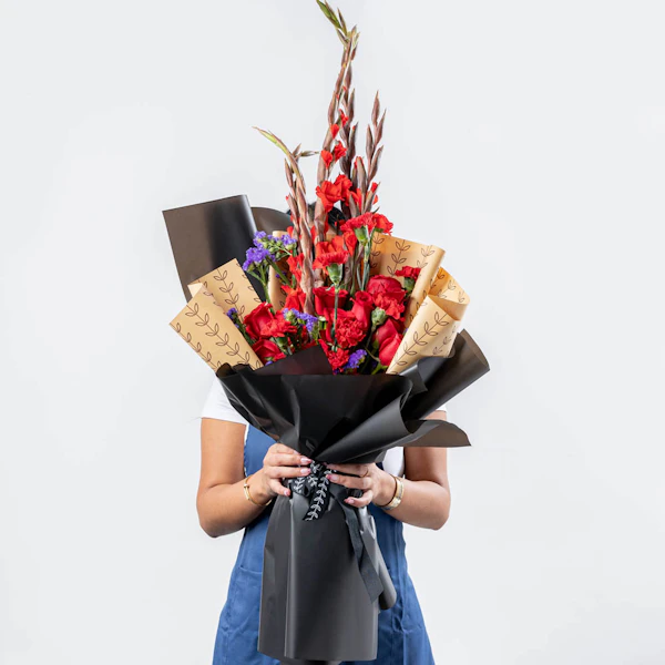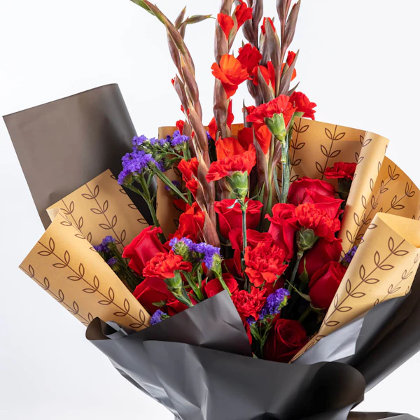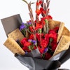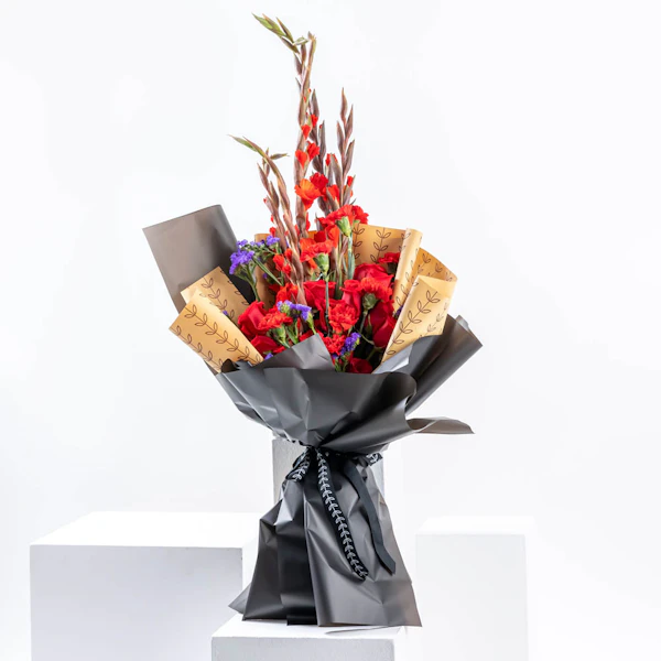 The Red Gladiolus, Red Roses, and Red Carnations bouquet is a stunning arrangement of 40 flowers. This bouquet features striking red gladiolus, timeless red roses, and elegant red carnations. The flowers are carefully arranged in a beautiful bouquet and wrapped in a stylish Floward Design black wrap, adding a touch of sophistication to the overall presentation. This bouquet is a perfect choice to express passion, love, and admiration for someone special.