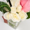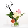 A lovely vase that contains a simple arrangement of white roses and pink anthuriums with green aralia and china’s green grass.