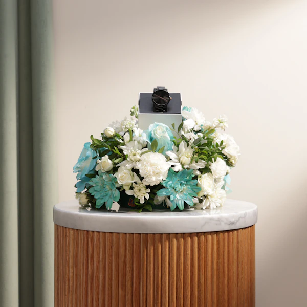 Embark on a journey of timeless elegance with our Calvin Klein Iconic Black Watch gift set. Encased in a chic white box, this sleek black timepiece exudes sophistication. Presented on a cloud of delicate blue roses, white carnations, matthiolas, baby roses, chrysanthemums, and lush green pistacia, it's a fusion of refined style and natural beauty. Perfect for any occasion, this gift set transcends gender with its unisex appeal. Featuring a black stainless-steel strap and black dial, the watch adds an extra layer of allure. Elevate your ensemble with this exquisite set, embodying understated luxury and sophistication.