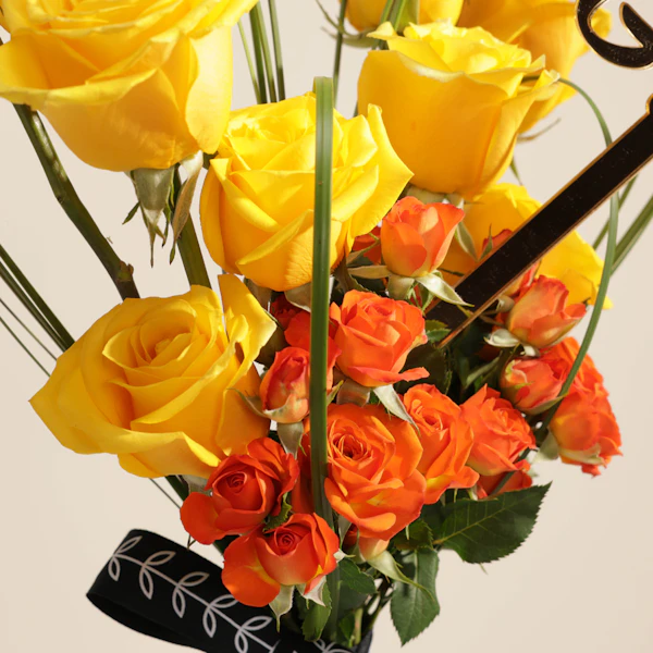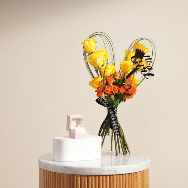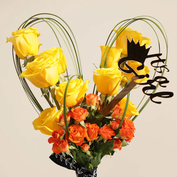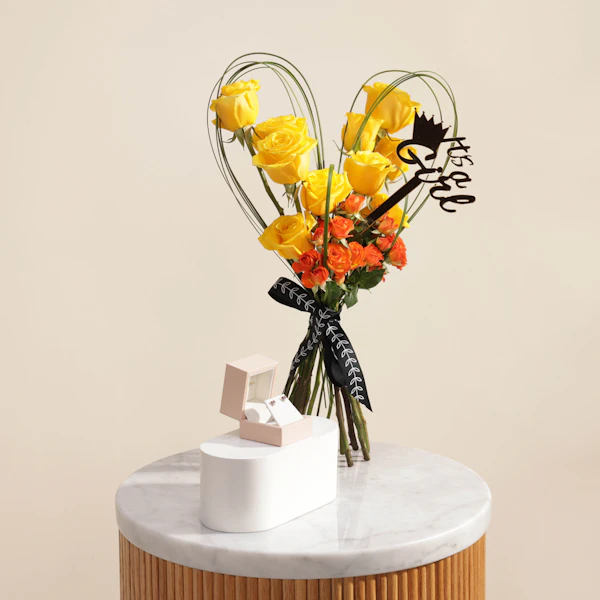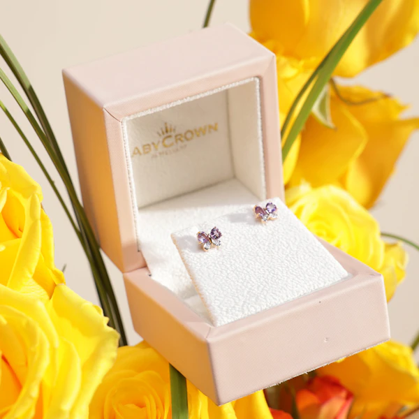 AED2260Celebrating the new family member with Delight regal charm of the Baby Crown Rose Earrings, featuring sparkling diamonds, natural amethyst stones, and exquisite yellow and orange baby roses. These earrings combine the timeless elegance of precious gemstones with the delicate beauty of miniature roses, creating a stunning accessory that exudes sophistication and grace. Perfect for adding a touch of luxury to any outfit, these earrings make a memorable gift for for new baby born.