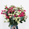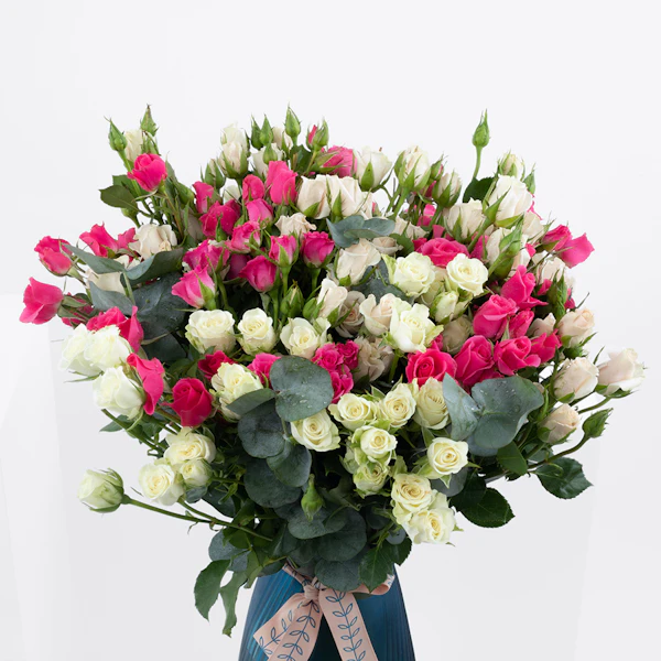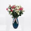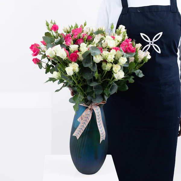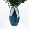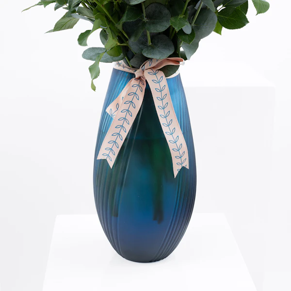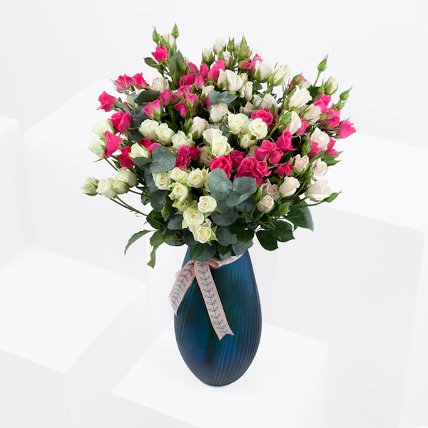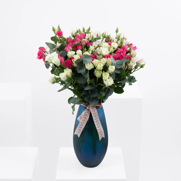 This stunning blue glass vase features delicate baby roses nestled amongst lush green eucalyptus leaves. The soft pastel hues of the roses contrast beautifully against the rich blue glass, creating a captivating display of natural beauty. Perfect for adding a touch of elegance to any room, this vase is the ideal choice for those who appreciate the finer things in life.