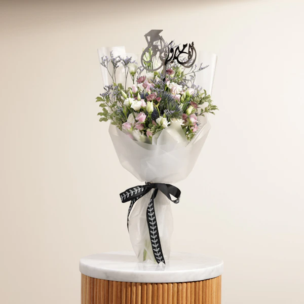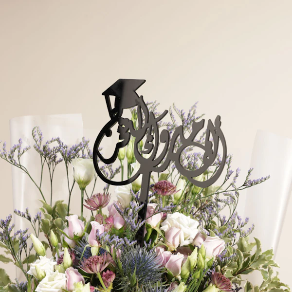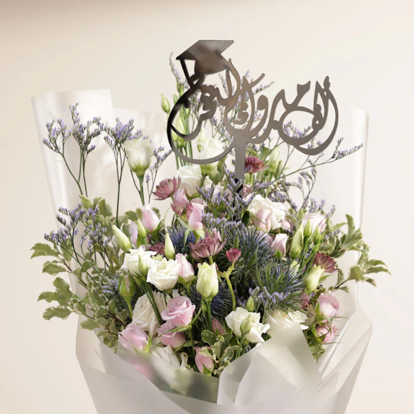 Celebrate your loved one's achievement with a stunning arrangement featuring purple baby roses, Purple Astrantia, white Eustoma, blue eryngium, purple Limonium. Wrapped in white frosted wrap and adorned with an elegant jute ribbon, this bouquet is the perfect way to convey your heartfelt congratulations. Make their special day even more memorable with our exclusive Congratulations on Your Graduation topper in Arabic, adding a personalized touch to their celebration. Bring joy and happiness to their milestone moment with this beautiful gift!