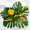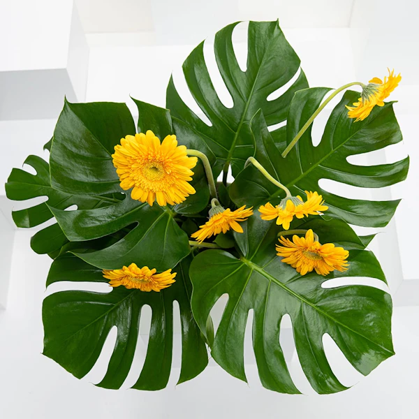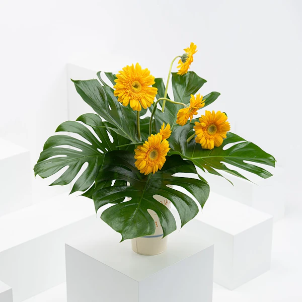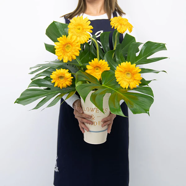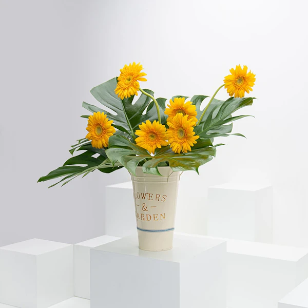 Magical and exquisite, this radiant arrangement of Gerbera will take you on an enchanting journey as soon as you lay eyes on it. In a sleek metal vase, six yellow gerbera flowers stand like rays of sunshine, a burst of vibrant energy captured in a compact arrangement. The petals exude a cheerful warmth against the cool backdrop of the metallic container, creating a visual harmony. This minimalistic yet lively ensemble effortlessly elevates any space, proving that a small cluster of yellow blooms in a metal vessel can be a radiant focal point, bringing joy and a touch of contemporary elegance to the surroundings.