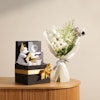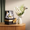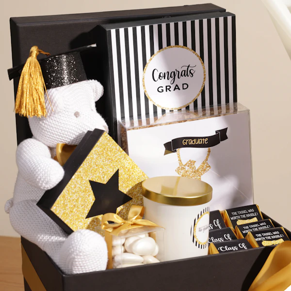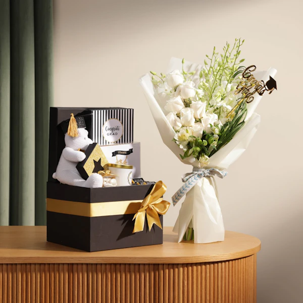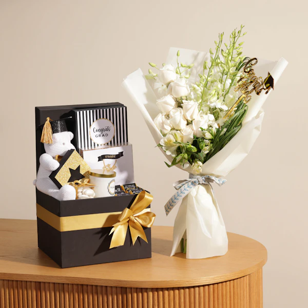 Celebrate their big day with the perfect graduation gift! Buy graduation gifts like the Le Chocolatier Graduation Chocolate Large Hamper, featuring 25 pieces of gourmet chocolate, 50 grams of almond dragees, 100 grams of crunchies, and 70 grams of caramelized nuts. This luxury gift online also includes a beautifully decorated scented glass jar candle and a stunning bouquet of White Baby Orchid, White Alstroemeria, and White Rose, all wrapped in elegant white wrap with a graduation stick. Send the best gift now and make their graduation unforgettable!