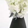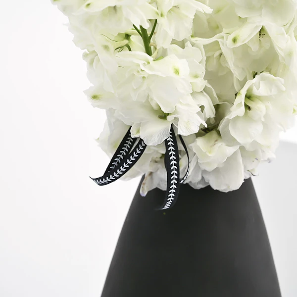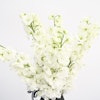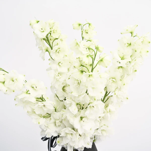 - A unique vase that's arranged with 5 white delphiniums.