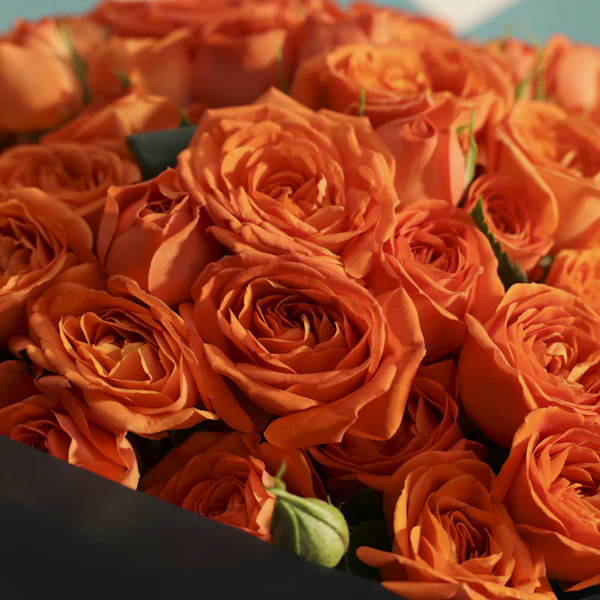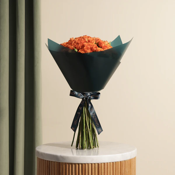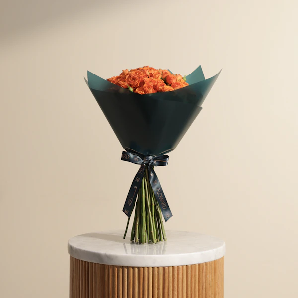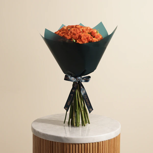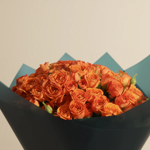Brighten someone's day with the vibrant orange baby rose bouquet, elegantly wrapped in luxurious dark teal. This stunning arrangement features orange baby roses, symbolizing joy, enthusiasm, and admiration. Perfect for any occasion, this bouquet brings a burst of color and a touch of sophistication to your loved one's space. Imagine their delight as they receive this gorgeous gift, a visual feast that uplifts and enchants. Whether you're celebrating a special moment or simply want to show you care, this bouquet is a heartfelt gesture that speaks volumes. Surprise your loved ones with the orange baby rose bouquet and create unforgettable memories. Order now for a delightful and memorable gift experience.