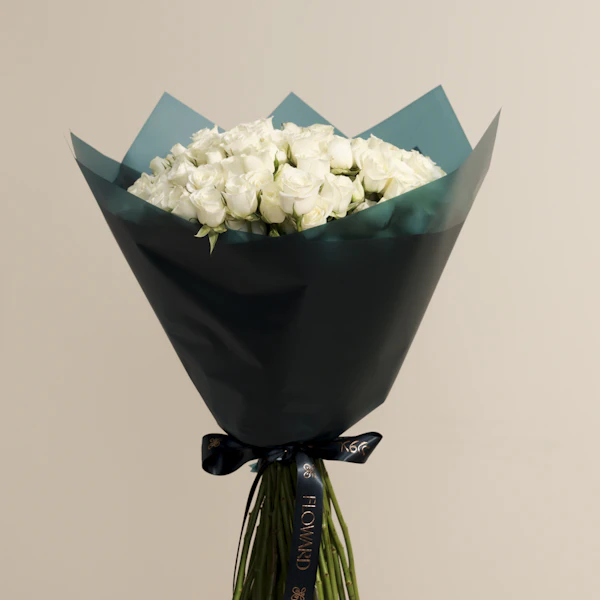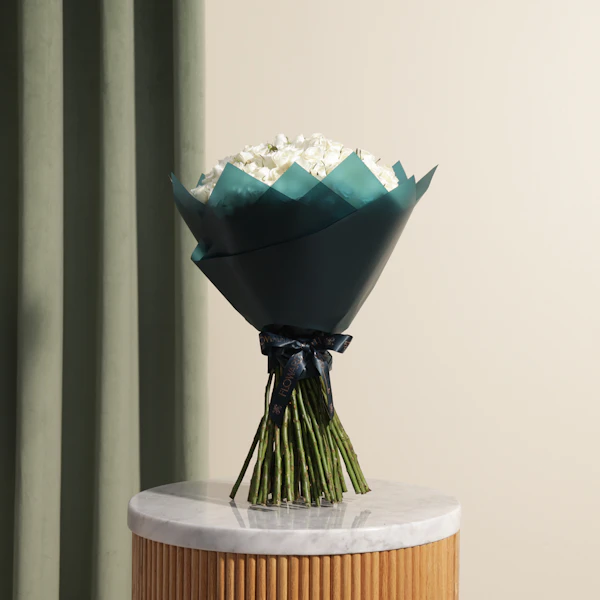The White Baby Rose in Dark Teal Wrap is a sophisticated and elegant gift. The pure white rose, symbolizing purity and grace, is beautifully contrasted by the rich dark teal wrap, creating a striking and refined presentation. This combination makes for a perfect gesture of admiration or celebration, adding a touch of class and charm to any occasion Order now to enjoy these exquisite flowers and brighten your loved ones' day.