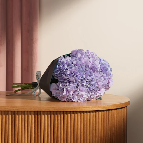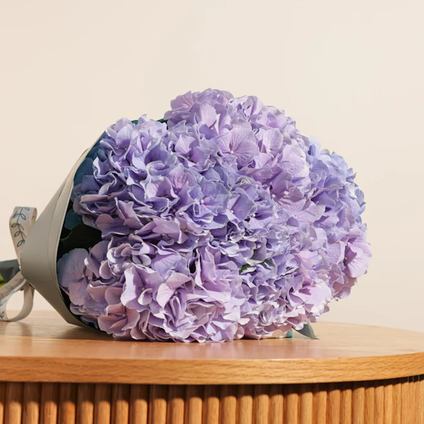 Experience the elegance of our Purple Hydrangea bouquet, beautifully arranged with five lush blooms and wrapped in sleek black paper. This stunning bouquet captures the essence of luxury and sophistication, making it the perfect gift for any occasion. Brighten someone's day with the regal charm of these seasonal flowers. Order flowers online now and let the vibrant hues of purple hydrangeas bring joy to your loved ones. Same-day delivery available. Purchase today and add a touch of elegance to their life!