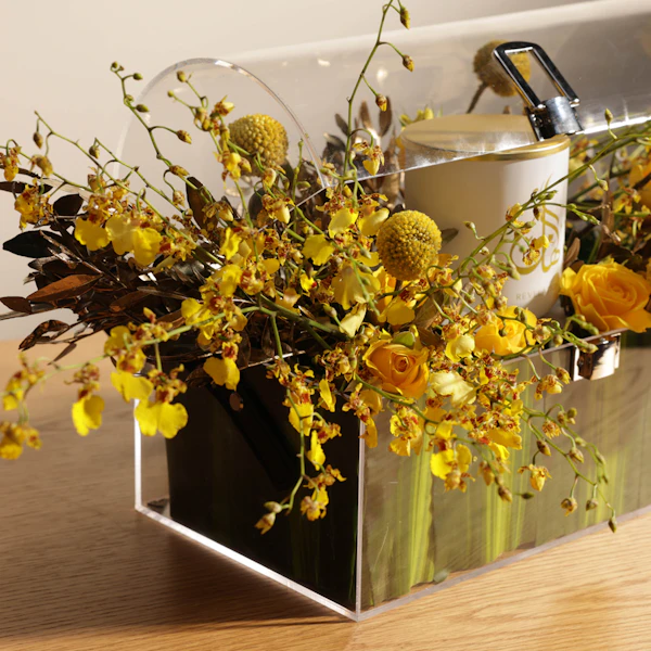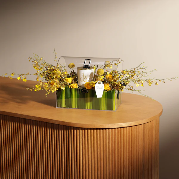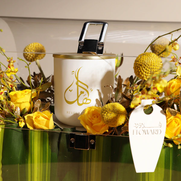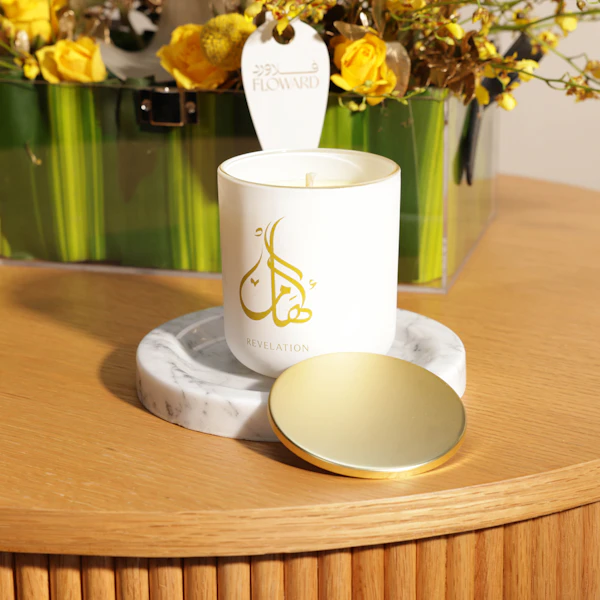 Gift your loved one Revelation Candle from Light of Sakina, an enchanting blend of flowers & musk, delicately nestled atop a vibrant arrangement of yellow blooms, adorned with lush green leaves, all elegantly presented in a transparent acrylic box. This exquisite gift is not just a treat for the senses but a heartfelt expression of love and joy. Bring happiness to your loved one's doorstep with this radiant token of affection.