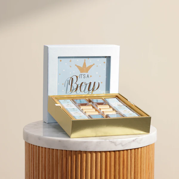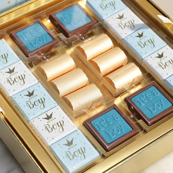 Celebrate the arrival of a new baby boy with a luxury gift from Bostani. It's a boy chocolate box. This elegant box contains 40 pieces of mixed-flavor chocolates, each crafted to delight. Ideal for marking this special occasion, this chocolate box offers a sweet and sophisticated touch to your celebration. Order luxury gifts online for a smooth shopping experience and have this beautiful box delivered directly to your door. Make the new arrival celebration even sweeter with this charming and delectable gift.