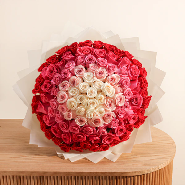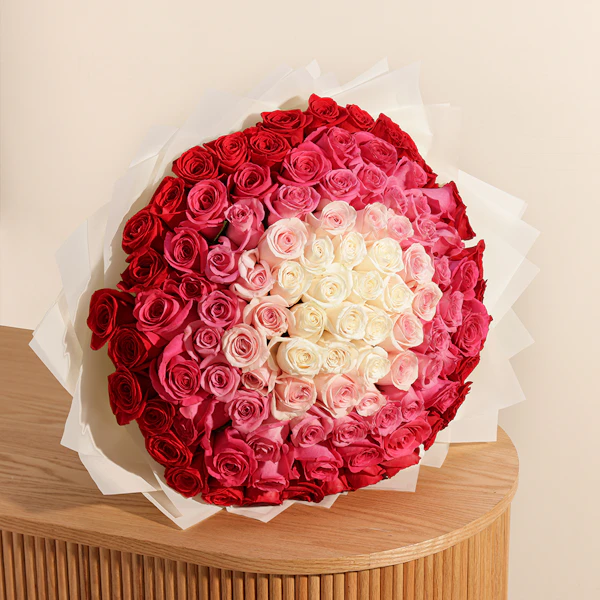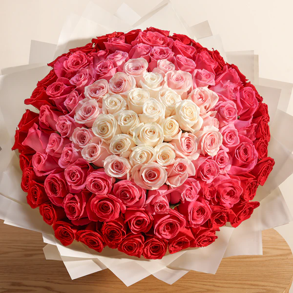 Celebrate any occasion with our Elegant Rose Symphony Bouquet! This exquisite hand-tied bouquet features a harmonious mix of red, pink, light pink, fuchsia, and white Roses, creating a stunning array of color and elegance. Wrapped in pristine white paper, it offers a timeless and sophisticated touch to your gift. Perfect for expressing heartfelt sentiments or adding a touch of beauty to any celebration, this bouquet combines classic charm with vibrant hues, making it an ideal choice for those who appreciate both grace and color in their floral gifts.