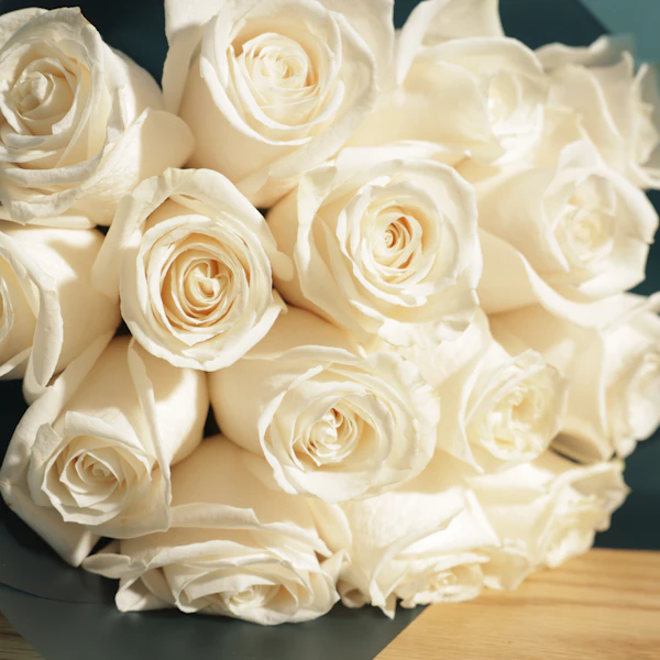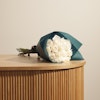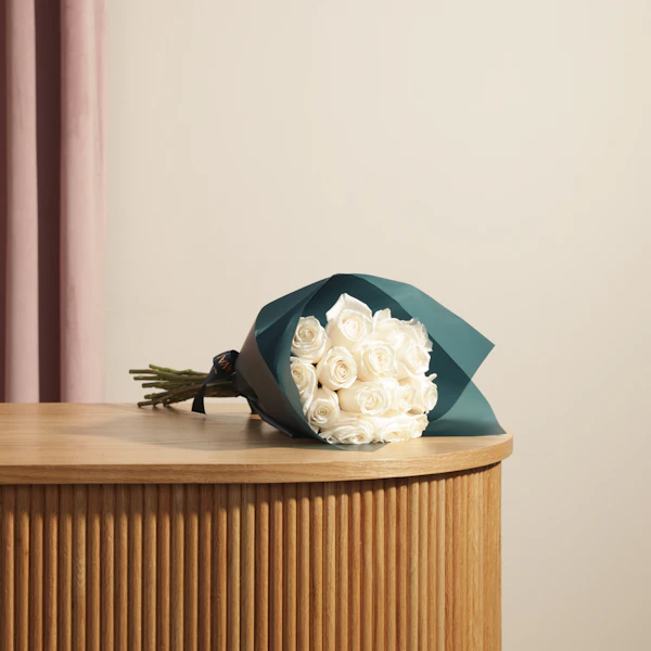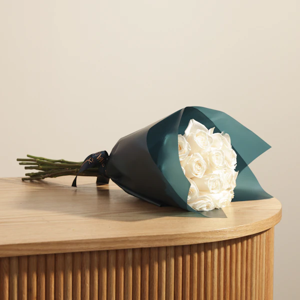 Illuminate any occasion with our elegant white roses in dark teal wrapping. This refined small bouquet features pristine white roses, gracefully wrapped in dark teal for a touch of sophistication and contrast. Ideal for conveying purity, appreciation, or celebrating special moments, this bouquet adds a chic flair to any event. Whether you're giving a thoughtful gift or enhancing your own space, our white roses in dark teal wrapping is a stunning choice. Order now to experience the timeless beauty of these roses!