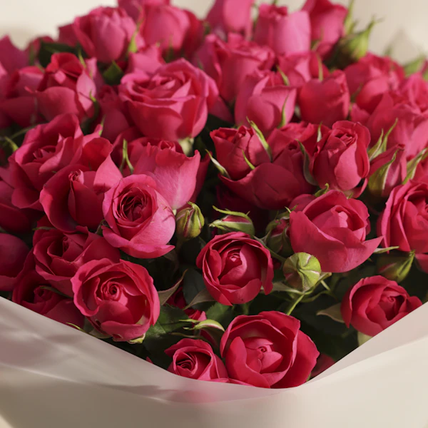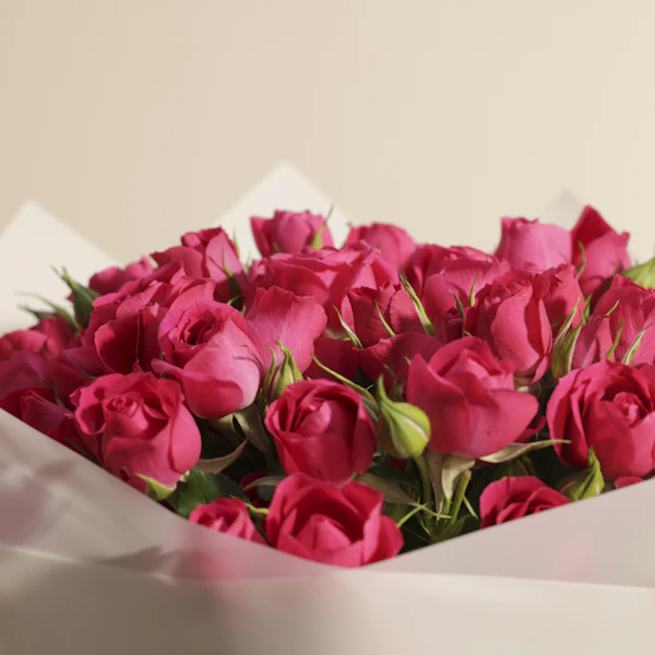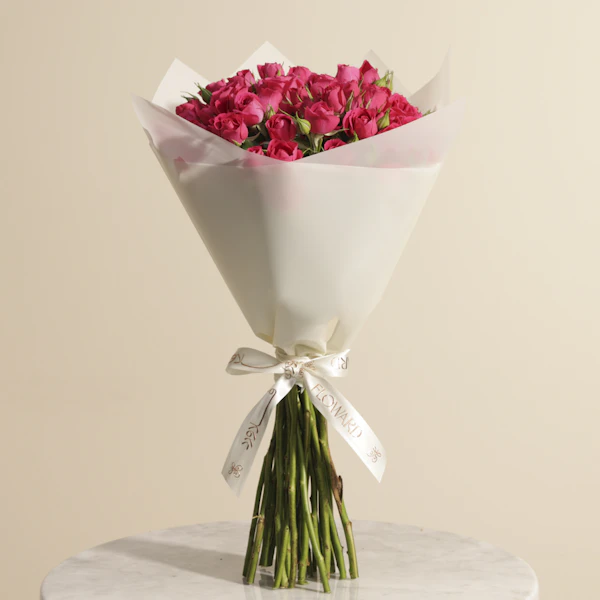 Surprise your loved one with this delightful fuchsia baby rose bouquet, wrapped in elegant cream. This stunning bouquet of lush fuchsia roses, each one bursting with joy and charm, is elegantly presented in a soft cream wrapping, creating a beautiful contrast that is sure to make a lasting impression. Whether you're celebrating a milestone or simply brightening someone's day, this bouquet is the perfect way to show you care. Imagine the smile it will bring to your loved one's face! Add a touch of excitement and elegance to their day with this fuchsia baby rose bouquet. Order now and make every moment unforgettable!