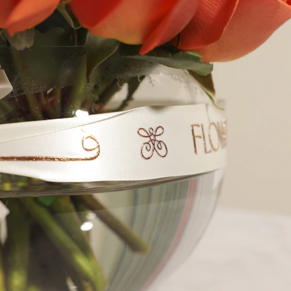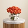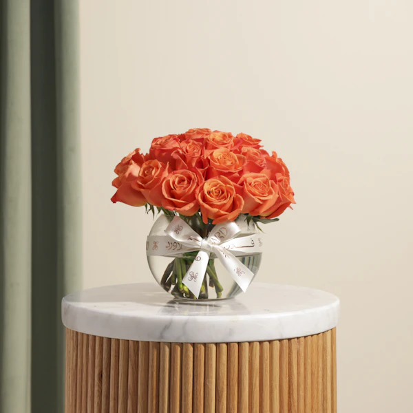 This vibrant gift features a striking arrangement of orange roses, known for their bold and energetic color. Each rose is carefully selected for its freshness and brilliance and elegantly displayed in a sleek fishbowl glass vase. The clear, round vase highlights the vivid blooms while offering a contemporary touch to the classic beauty of the roses. This visually appealing combination creates a charming and modern centerpiece, perfect for brightening up any space, celebrating special occasions, or expressing lively, heartfelt sentiments Order now to enjoy these exquisite flowers and brighten your loved ones' day!