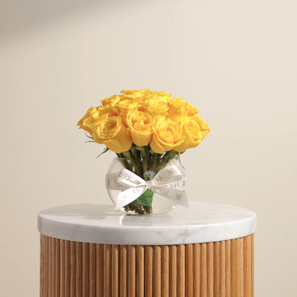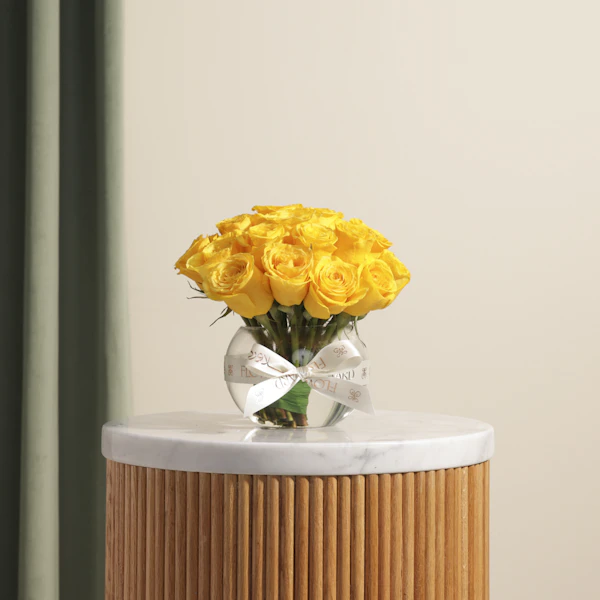 BHD21Discover the elegance of Yellow Roses in a Glass Vase, the perfect luxury gift for any occasion. This stunning arrangement showcases the vibrant beauty of Yellow roses, creating a captivating display that adds a touch of sophistication to any setting. Ideal for birthdays, anniversaries, or just because this luxurious arrangement is sure to impress. Order now to enjoy the best luxury flower delivery and make your special moments unforgettable. Indulge in luxury gifts online with this exquisite floral arrangement.