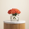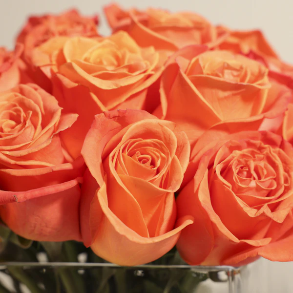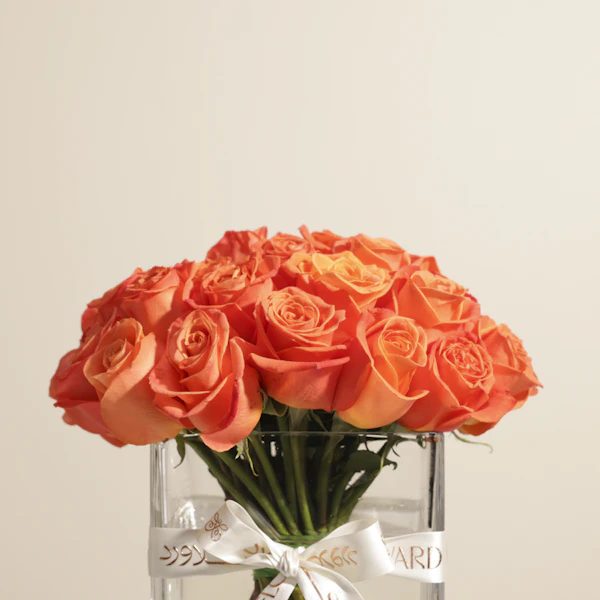 This vibrant gift features a striking arrangement of orange roses, known for their bold and energetic color. Each rose is carefully selected for its freshness and brilliance and elegantly displayed in a Square glass vase. The clear, vase highlights the vivid blooms while offering a contemporary touch to the classic beauty of the roses. This visually appealing combination creates a charming and modern centerpiece, perfect for brightening up any space, celebrating special occasions, or expressing lively, heartfelt sentiments Order now to enjoy these exquisite flowers and brighten your loved ones' day!