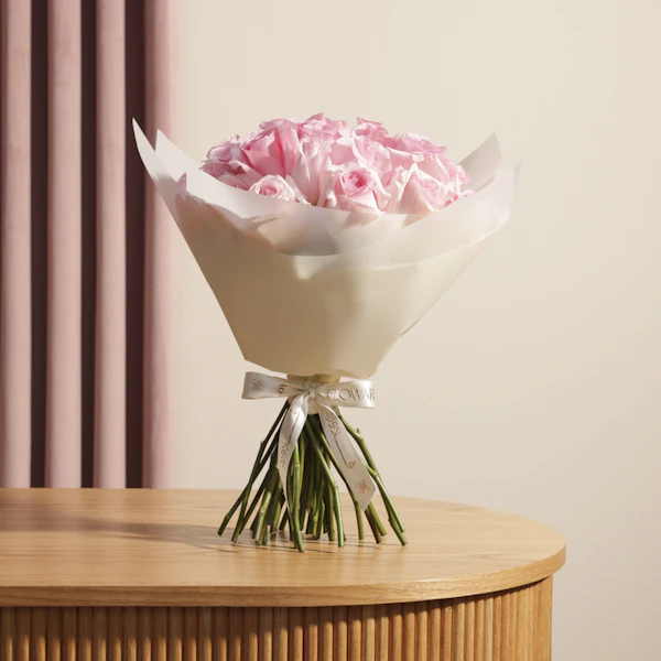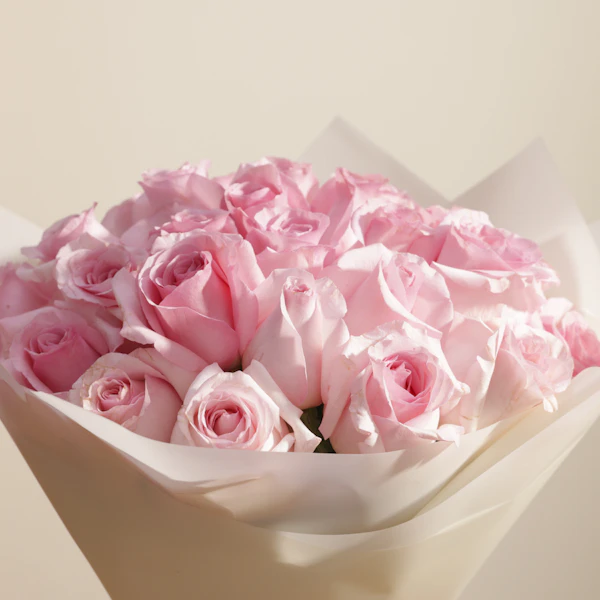 This exquisite gift showcases a stunning arrangement of pink roses, each bloom chosen for its vibrant color and velvety texture. The roses are thoughtfully arranged and elegantly wrapped in luxurious cream paper, creating a striking contrast that enhances the rich, passionate hue of the flowers. The sophisticated cream wrap adds a touch of modern elegance and refinement, making this bouquet a perfect choice for conveying heartfelt emotions, celebrating special occasions, or simply showing someone how much they mean to you. The combination of the classic pink roses with the contemporary cream wrap makes this gift both timeless and stylish, ensuring it will leave a memorable impression Order now to enjoy these exquisite flowers and brighten your loved ones' day.