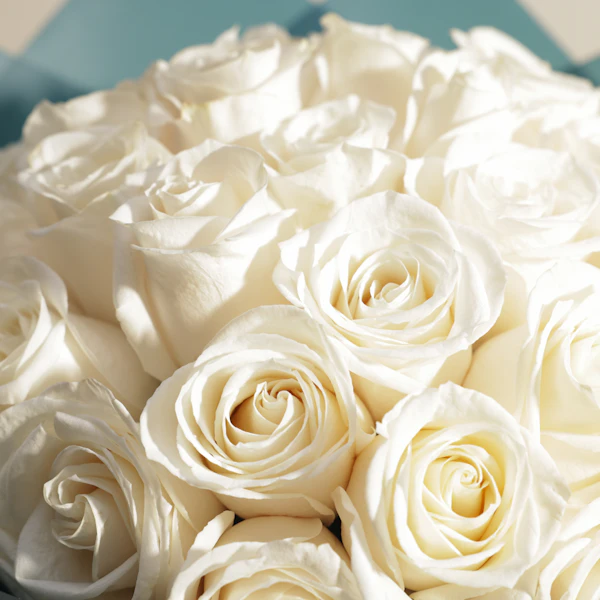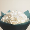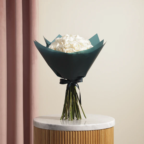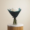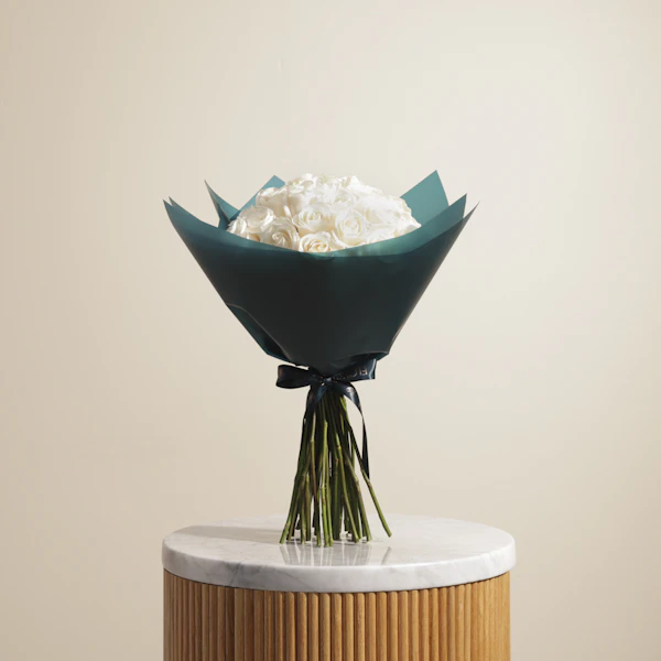 This sophisticated gift features a bouquet of pristine white roses, each bloom chosen for its purity and elegance. The roses are gracefully arranged and wrapped in luxurious dark teal paper, creating a striking contrast that highlights the delicate beauty of the flowers. The deep teal wrap adds a touch of modern sophistication, enhancing the timeless charm of the white roses. This combination of classic elegance and contemporary style makes the bouquet an ideal choice for celebrating special moments, expressing refined sentiments, or adding a touch of grace to any occasion Order now to enjoy these exquisite flowers and brighten your loved ones' day.