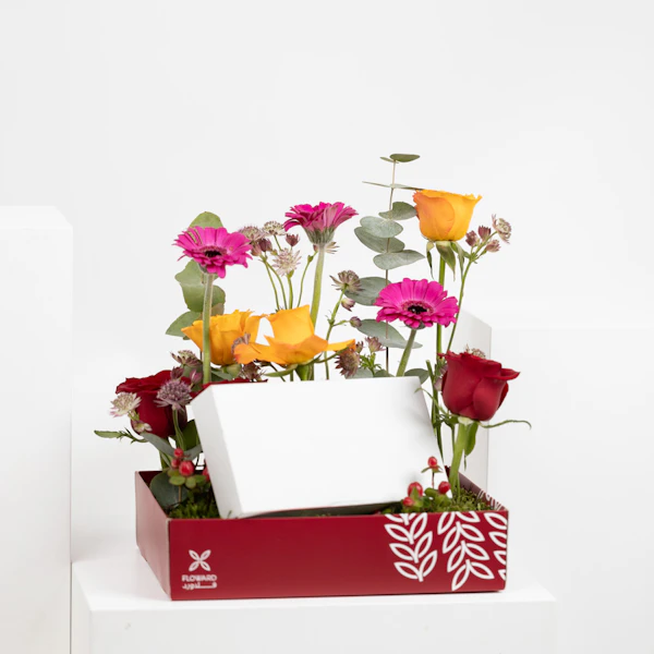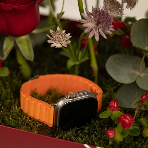 Elevate any celebration with the Apple Watch Ultra 2 GPS + Cellular! With its sleek 49mm titanium case and vibrant orange strap, this timepiece is both stylish and functional. Paired with a stunning floral arrangement featuring a mix of pink gerberas, orange and red roses, pink astrantia, red hypericum, and fresh eucalyptus, all presented in a striking red big hardcover box, this gift is sure to impress. Whether it's a birthday, anniversary, or any special occasion, this combination of cutting-edge technology and exquisite florals is the perfect way to show your appreciation and love.