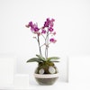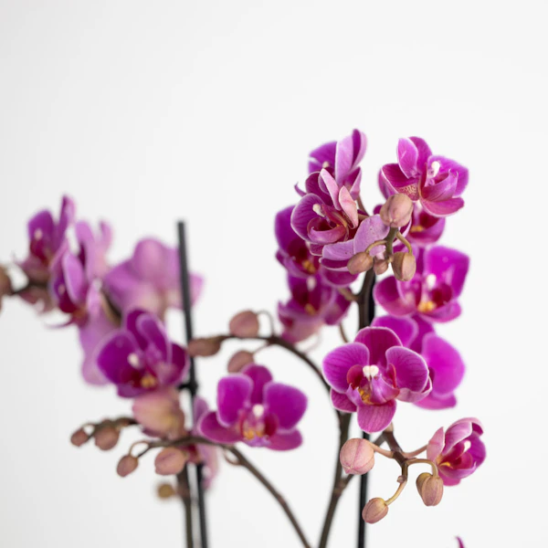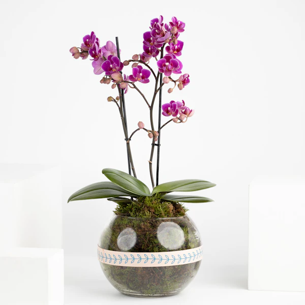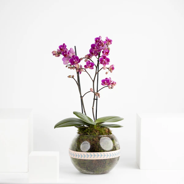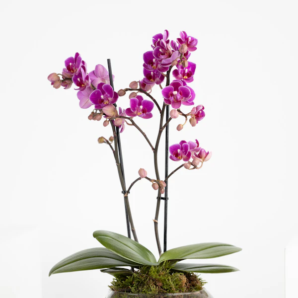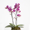 A purple Phalaenopsis orchid, also known as a Moth Orchid, is a beautiful and exotic mini plant that can be used to add a touch of elegance to any space. With its graceful arching stems and delicate purple blooms, it is a popular choice for home decor, special occasions, and gifts. Phalaenopsis orchids are known for their long-lasting blooms and low-maintenance care requirements, making them a great choice for those who want a stunning plant without fuss. They prefer bright, indirect light and high humidity, and should be watered when the top inch of the soil is dry. With proper care, a Phalaenopsis orchid can provide months of beauty and make a lovely addition to any room.