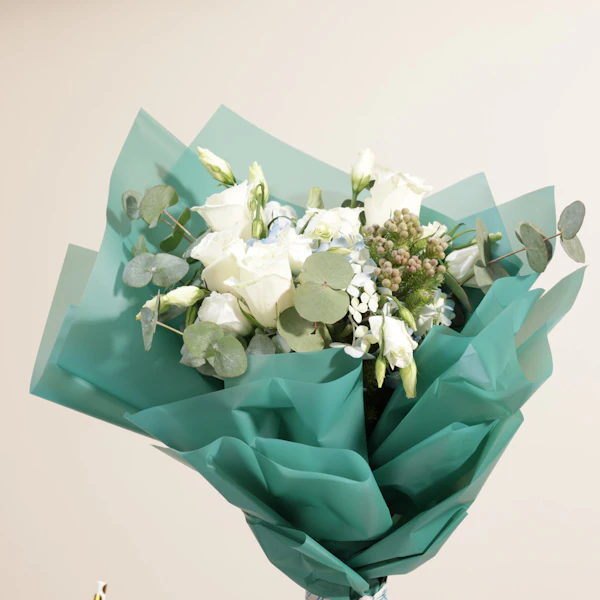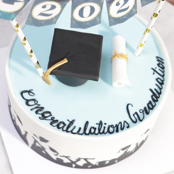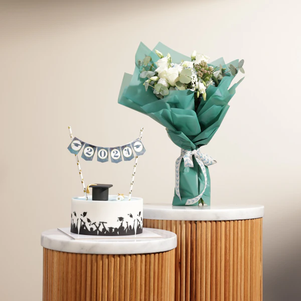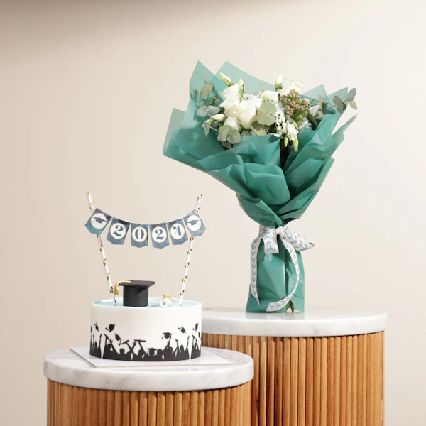 Celebrate a significant achievement with the delightful cake boutique Graduation Cake, boasting a tantalizing chocolate trio flavor and adorned with heartfelt words Graduation, Congratulations Graduation. Each bite is a sweet tribute to success and determination. Accompanying this delectable treat is a stunning bouquet of White Rose, Blue Hydrangea, and White Eustoma Together, the cake and bouquet create a heartfelt expression of pride and joy, marking a momentous milestone with sweetness and beauty.