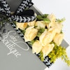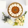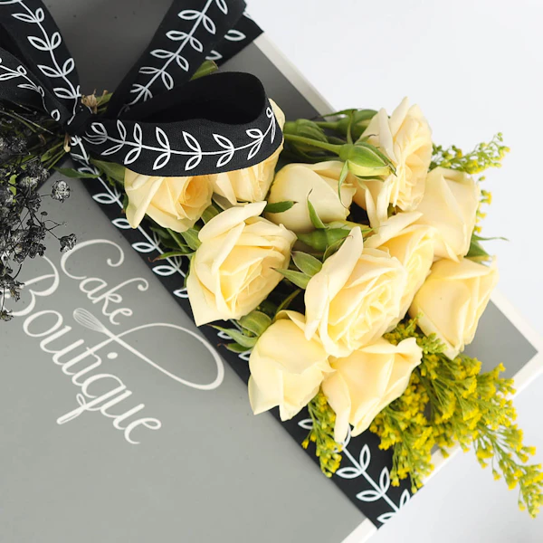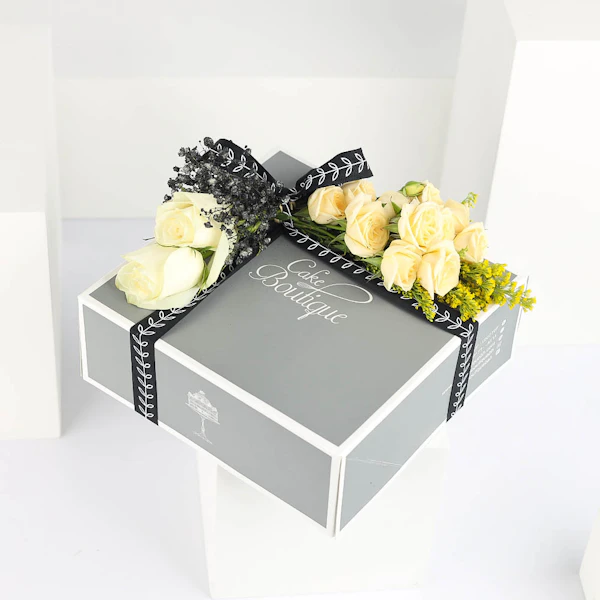This delightful gift features Cake Boutique’s luxurious lotus biscuit base cheesecake, crowned with rich lotus creamy cheesecake and adorned with Chantilly cream swirls. Accompanying this delectable treat is a bouquet of five exquisite flowers, including pristine white roses, delicate peach baby roses, and vibrant solidago. The cheesecake embodies indulgence and culinary excellence, while the floral arrangement adds an element of natural beauty and elegance. The combination of flavors and visual appeal creates a memorable sensory experience. This thoughtful gift leaves a lasting impact, evoking feelings of joy and appreciation, and celebrating both taste and beauty in a harmonious and elegant presentation.