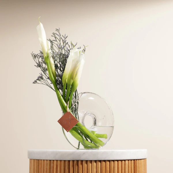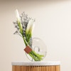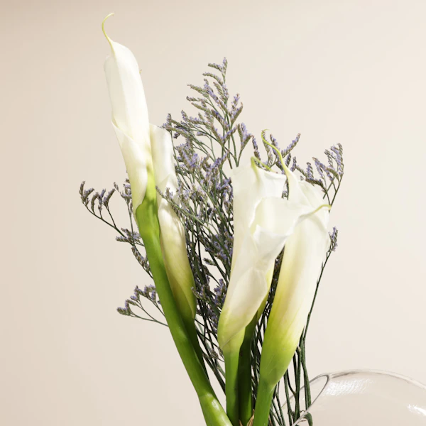 BHD18Elevate any space with our exquisite arrangement featuring the delicate beauty of White Calla and the vibrant allure of Purple Limonium, meticulously crafted in a Round Glass Vase. Perfect for any occasion, from birthdays to anniversaries, this stunning ensemble adds a touch of elegance and sophistication to any setting. Whether you're expressing gratitude, celebrating love, or simply adding a dash of charm to your décor, our arrangement effortlessly captures attention and admiration. With its timeless appeal and impeccable design, it's not just a gift—it's a gesture of refined taste and heartfelt sentiment. Order now to brighten someone's day with this captivating display.