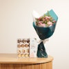 Delight your loved one on their birthday with the CocoaNuts Happy Birthday Box. This exquisite gift combines luxury with artistry, featuring a handpicked selection of gourmet delights. The box is beautifully presented with a bouquet of fuchsia baby roses and pink carnations, elegantly wrapped in white and green. Celebrate their special day with a perfect blend of indulgence and floral beauty. Order now to make their birthday truly memorable.