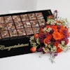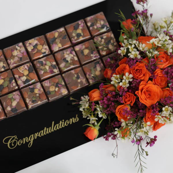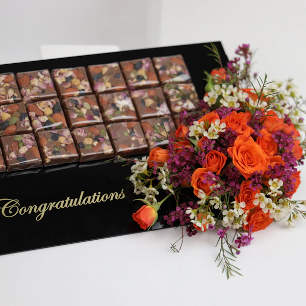 Embrace the joy of a memorable occasion with our opulent acrylic black tray, adorned with Floward's finest mixed nut chocolates, accompanied by the vibrant beauty of orange roses and the subtle charm of purple and white wax flowers. It's a gift that encapsulates elegance and thoughtfulness, a token of appreciation that speaks volumes. Whether you're celebrating a milestone or simply expressing your affection, this gift is a timeless gesture that lets your loved ones know just how much they mean to you. Make their moment unforgettable with this exquisite blend of luxury and love.
