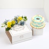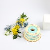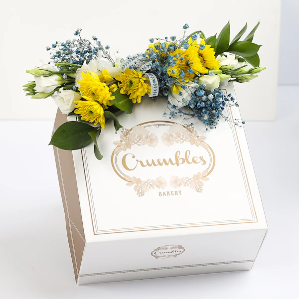 - 500g vanilla crispy cake coupled with a corsage arrangement containing Chrysanthemum, Eustoma , Gypsophilia and Ruscus