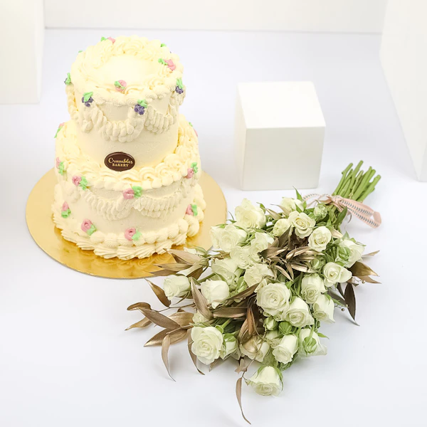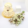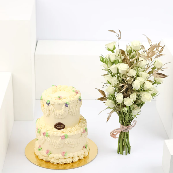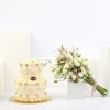 1.5 KG Vanilla Crispy Cake coupled with an arrangement containing Baby spry-White and Ruscus Gold