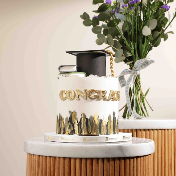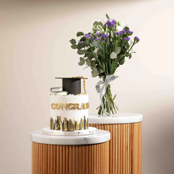 The Decorating Memories Graduation Cake, featuring a delectable Nutella Crunchy flavor, is designed to serve 14 people, making it perfect for celebratory gatherings. This cake combines rich, creamy Nutella with a satisfying crunch, creating a memorable dessert experience. Accompanied by a bouquet of nine flowers, including elegant White Eustoma and vibrant Blue Statice, it adds a touch of floral beauty to the celebration. The flowers symbolize admiration and success, enhancing the festive atmosphere. This thoughtful combination of a delicious cake and a beautiful bouquet not only delights the taste buds but also conveys heartfelt congratulations, leaving a lasting impression on the graduate and guests.