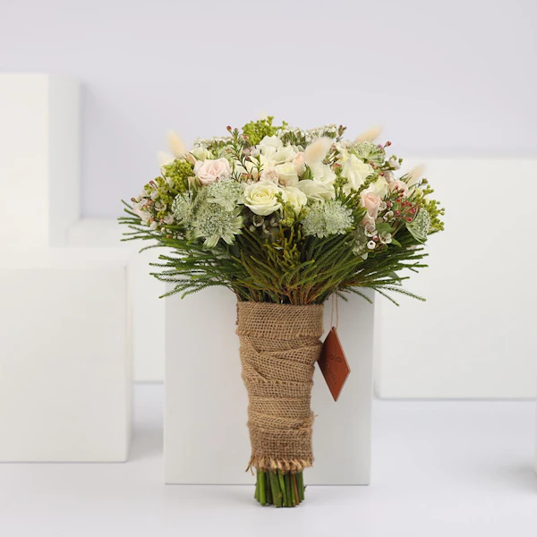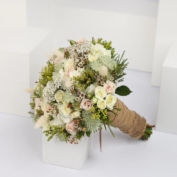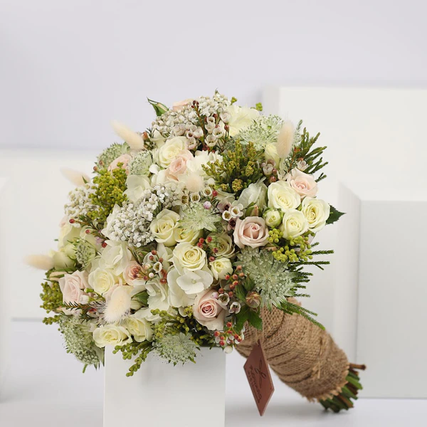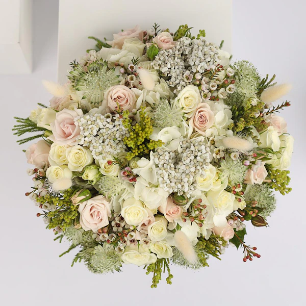Elouise contains baby roses, hydrangea, Dried Bunny Tail, Achillea, Astrantia, and Waxflower