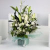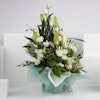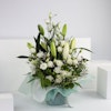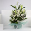 This arrangement contains Estoma, Lillies, Hypericum, Sea lavender, and salal