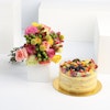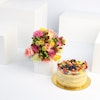 Share your feelings with CB's Fruit Gateaux; layers of vanilla sponge cake and custard cream topped with fresh fruits. Coupled with a bouquet of Roses, Hypericum, and Eryngium