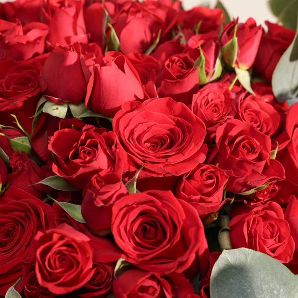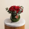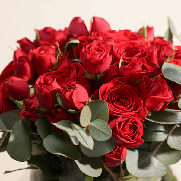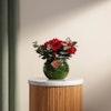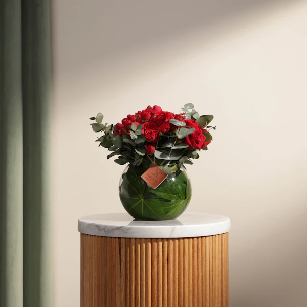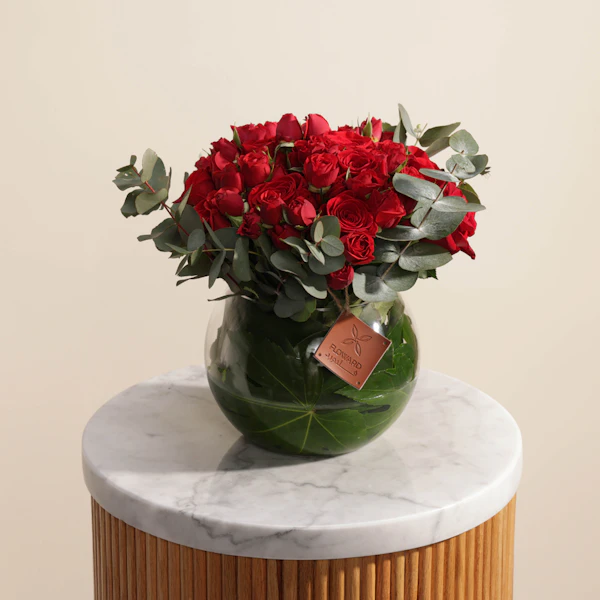 Elevate any occasion with our stunning floral arrangement featuring Red Roses, Red Baby Roses, Eucalyptus, and Green Aralia, gracefully arranged in a round glass vase. The rich, vibrant reds of the roses are beautifully complemented by the lush greenery of eucalyptus and aralia, creating a harmonious and sophisticated display. Perfect for expressing love, appreciation, or celebrating a special moment, this elegant bouquet adds a touch of natural beauty and charm to any setting. The round glass vase enhances the overall presentation, making this arrangement a captivating centerpiece that brings warmth and elegance to your space.