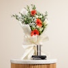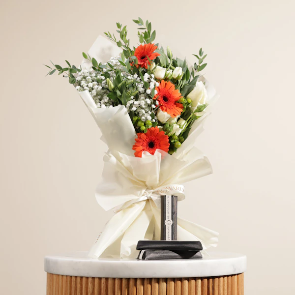 Indulge in a delightful gift that perfectly combines sweetness and elegance. The ghazl chocolate kunafa pistachio bars offer a unique blend of creamy chocolate and crunchy kunafa, infused with the rich taste of pistachios. Paired with a stunning floral arrangement featuring orange gerbera, white baby roses, green hypericum, white gypsophila, and white eustoma, this gift is sure to brighten anyone’s day. Whether you're celebrating a special moment or simply showing appreciation, this combination delivers both beauty and flavor in perfect harmony. Buy now to treat someone special to this unforgettable pairing!