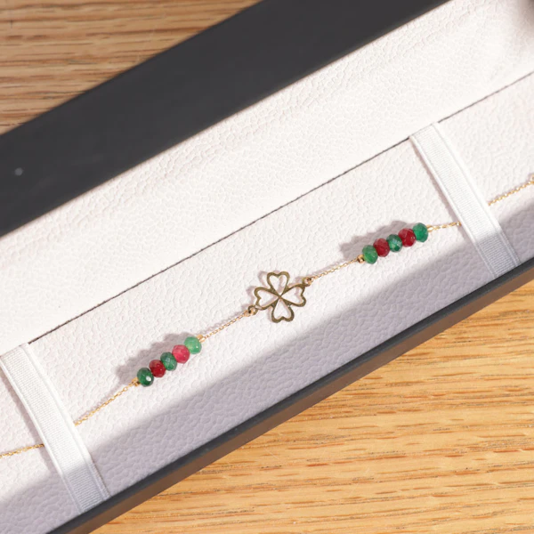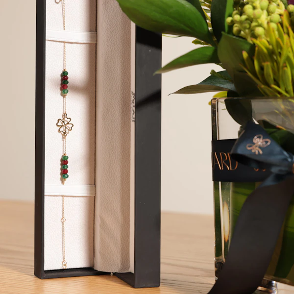 Discover the exquisite elegance of the Al alalawi Gold Bracelet Trefle, a stunning piece of fine jewelry crafted in 21K gold. Adorned with vibrant green and red precious stones, this 18cm bracelet weighs 1.5g and exudes luxury. Perfect as unique jewelry gifts, it pairs beautifully with a chic arrangement of purple roses, baby roses, and astrania in a glass square vase. Elevate your gift-giving experience and celebrate special moments with sophistication. Buy now and make every occasion memorable with this luxurious bracelet and floral arrangement.