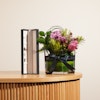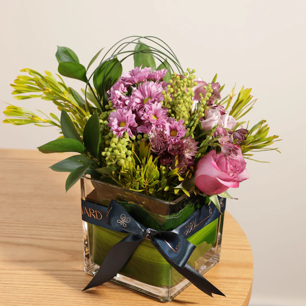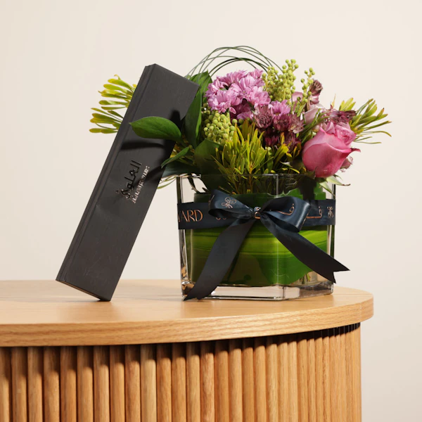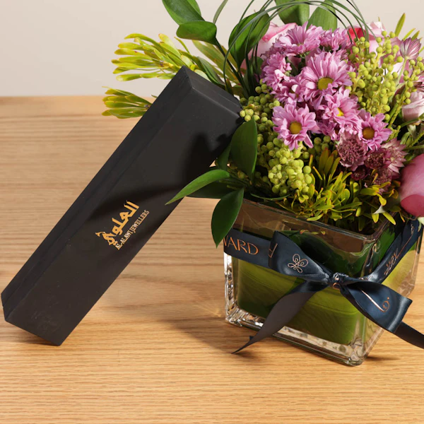 BHD122Discover the exquisite elegance of the Al alalawi Gold Bracelet Trefle, a stunning piece of fine jewelry crafted in 21K gold. Adorned with vibrant green and red precious stones, this 18cm bracelet weighs 1.5g and exudes luxury. Perfect as unique jewelry gifts, it pairs beautifully with a chic arrangement of purple roses, baby roses, and astrania in a glass square vase. Elevate your gift-giving experience and celebrate special moments with sophistication. Buy now and make every occasion memorable with this luxurious bracelet and floral arrangement.