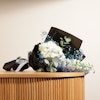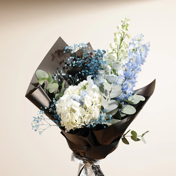 Celebrate life's special moments with an elegant bouquet featuring White Hydrangea, Light Blue Delphinium, and Blue Gypsophila, beautifully wrapped in black. This exquisite arrangement exudes sophistication and grace, making it the perfect gift for any occasion. The pristine white hydrangeas symbolize purity and gratitude, while the delicate blue delphiniums and gypsophilas add a touch of tranquility and charm. Whether it's a birthday, anniversary, or a gesture of appreciation, this stunning bouquet will convey your heartfelt sentiments in the most enchanting way.