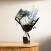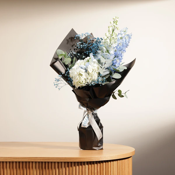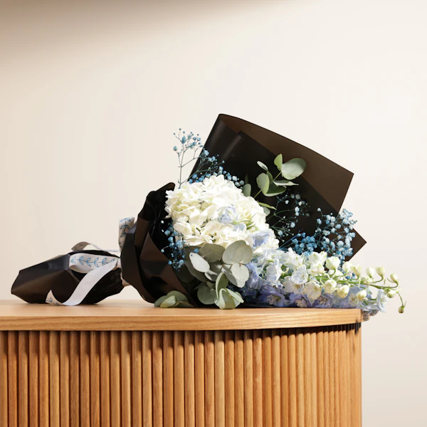BHD16Celebrate life's special moments with an elegant bouquet featuring White Hydrangea, Light Blue Delphinium, and Blue Gypsophila, beautifully wrapped in black. This exquisite arrangement exudes sophistication and grace, making it the perfect gift for any occasion. The pristine white hydrangeas symbolize purity and gratitude, while the delicate blue delphiniums and gypsophilas add a touch of tranquility and charm. Whether it's a birthday, anniversary, or a gesture of appreciation, this stunning bouquet will convey your heartfelt sentiments in the most enchanting way.