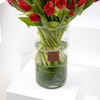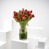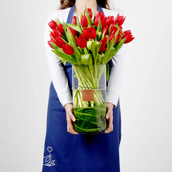Flowers are the way to the heart. Gift this lovely arrangement of red tulips to your loved one to express your feelings. This elegant vase brings feelings of love and affection to your loved ones, as it is simple in harmony with its wonderfully beautiful flowers. The flowers were arranged inside the vase for an endless home and flow, and the roses enchanted charm and attractiveness. This beautiful vase will be a great addition to any room as it radiates beauty and elegance, which makes it possible to gift it to your loved ones.